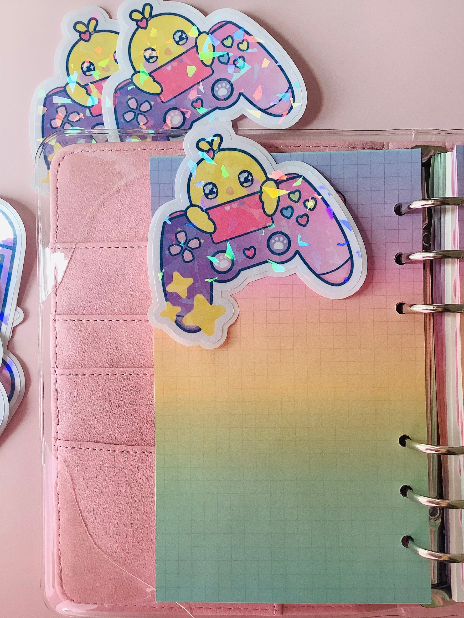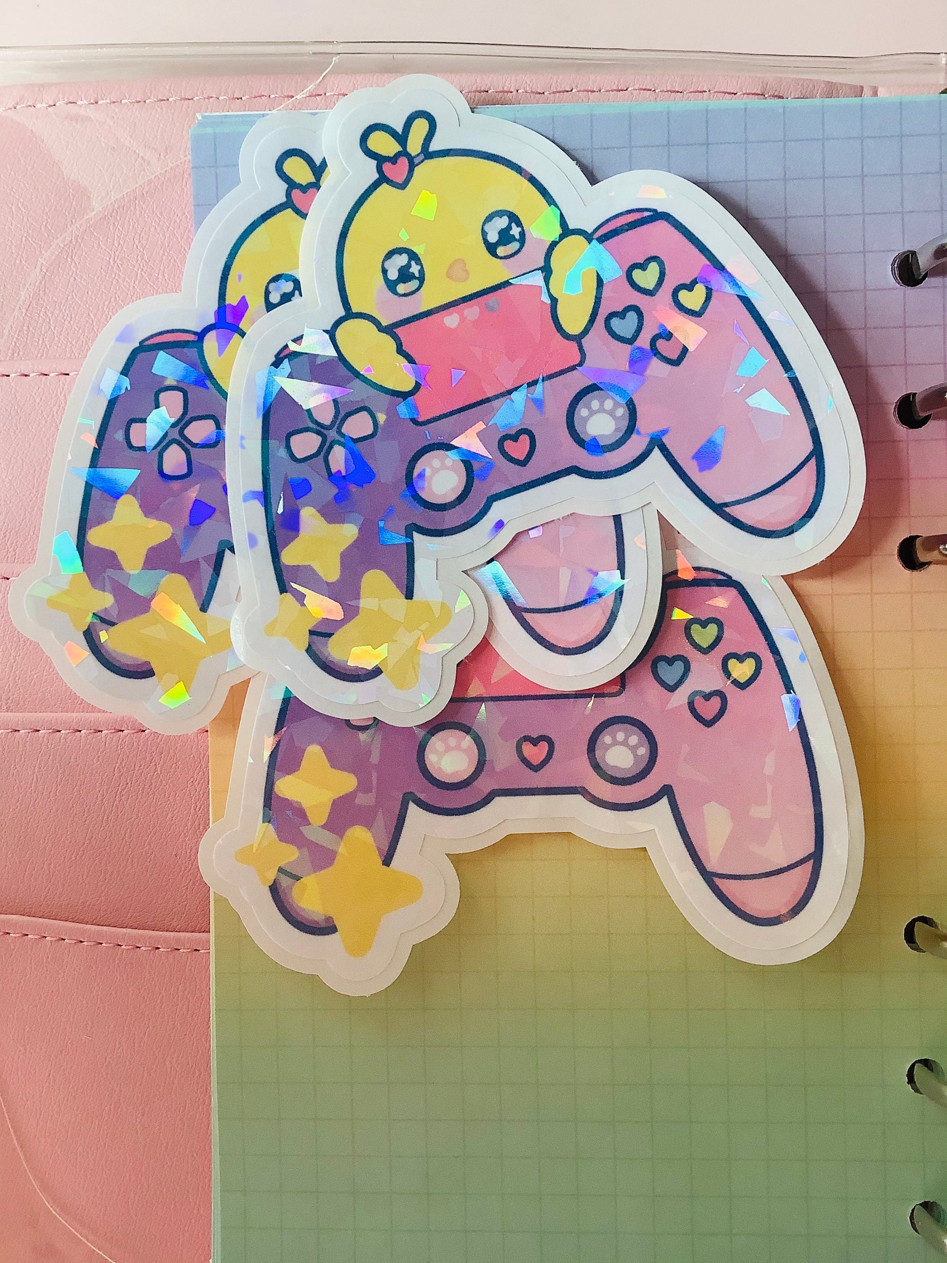 Pegatina pollito con mando de videoconsola. Tiene brillo holográfico.