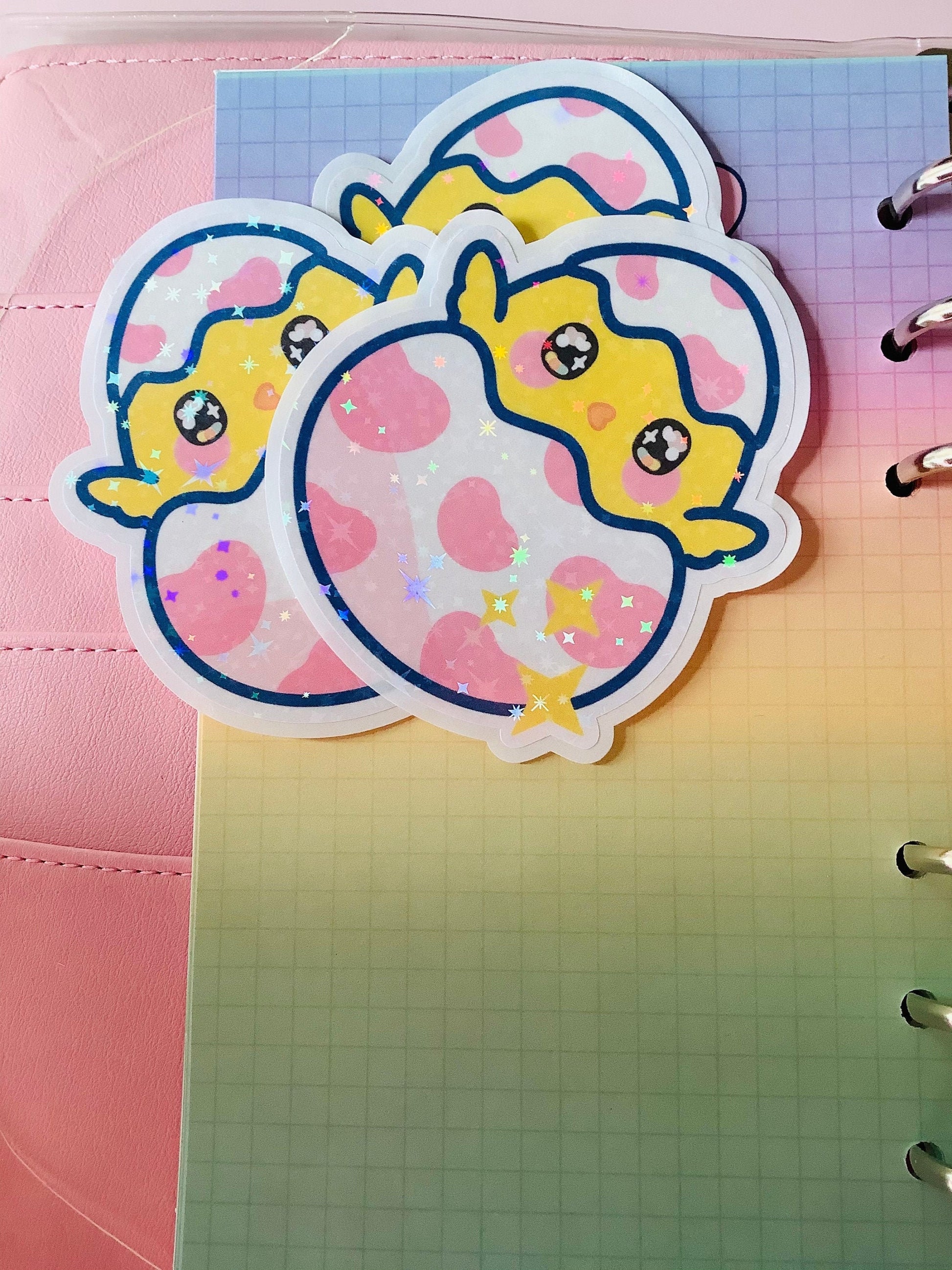 Pegatina del pollito Ostra, con brillo de estrellas holográfico.