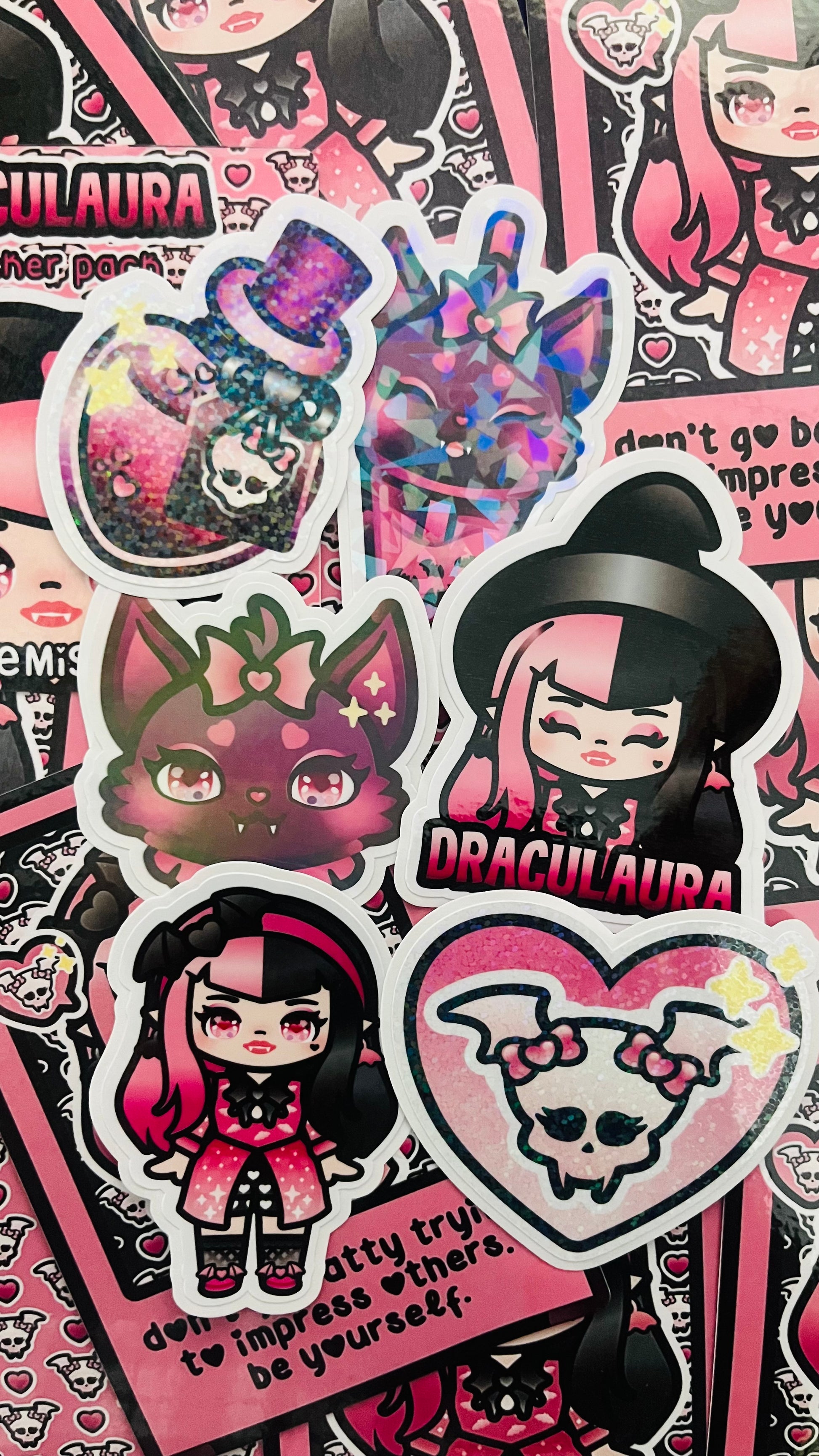 Si te gusta Draculaura y las pegatinas bonitas, ¡este pack de pegatinas kawaii te va a encantar! Incluye 6 pegatinas: 2 con laminado glossy y 4 con laminado holigráfico