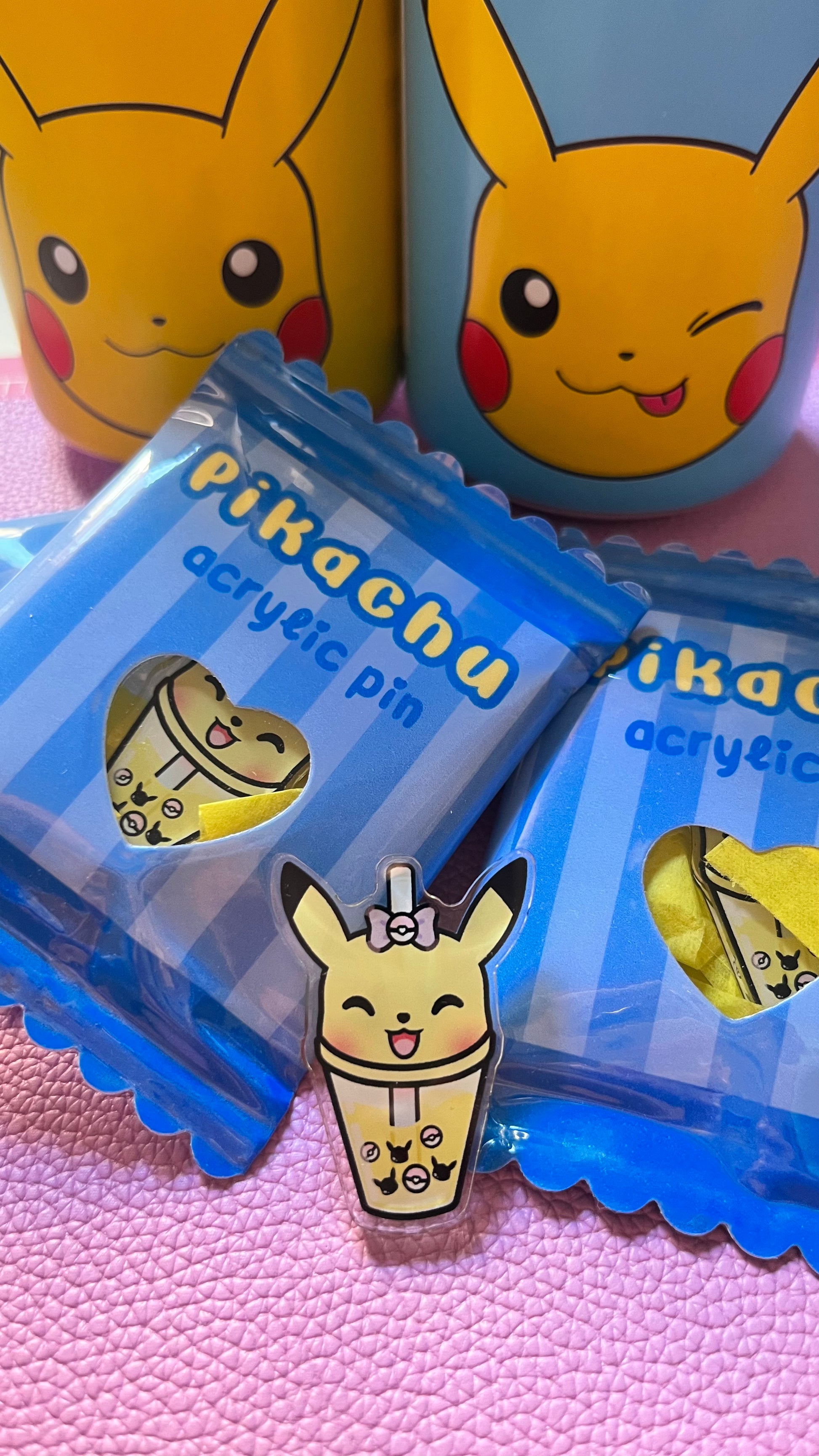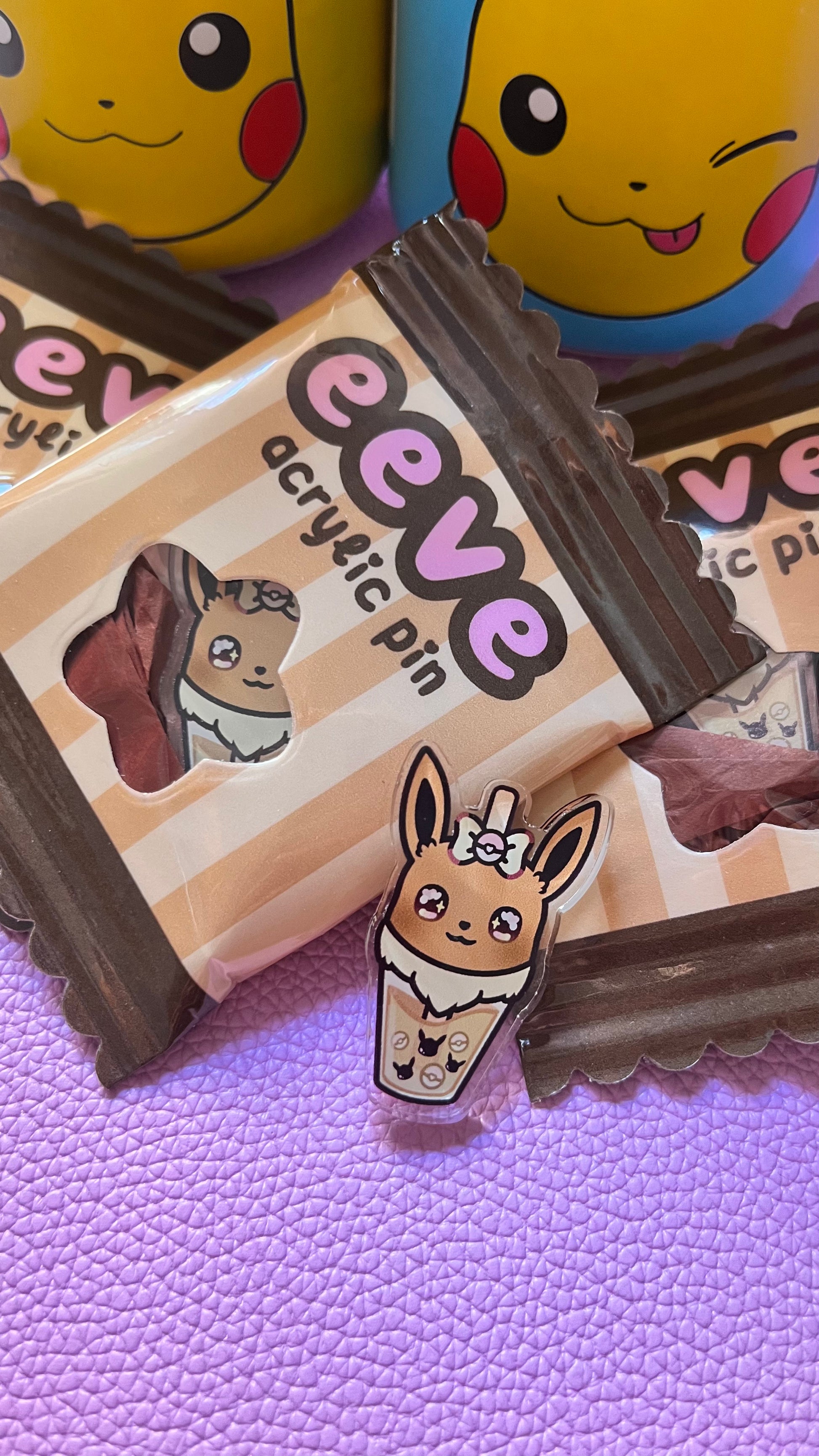 Pin acrílico con diseño de bubble tea inspirado en Pikachu y Eevee